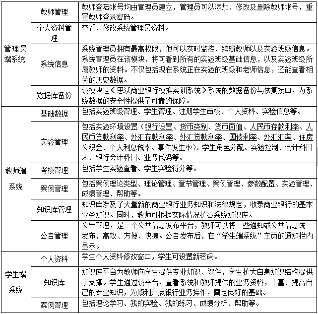 系統(tong)設(she)計開發模仿銀(yin)(yin)行(xing)(xing)(xing)(xing)(xing)組織結構:總(zong)行(xing)(xing)(xing)(xing)(xing)由(you)(you)(you)若(ruo)干分(fen)行(xing)(xing)(xing)(xing)(xing)構成,分(fen)行(xing)(xing)(xing)(xing)(xing)由(you)(you)(you)若(ruo)干支行(xing)(xing)(xing)(xing)(xing)組成。由(you)(you)(you)教師建(jian)立一個模擬的(de)商業(ye)(ye)(ye)(ye)(ye)(ye)銀(yin)(yin)行(xing)(xing)(xing)(xing)(xing)實(shi)(shi)(shi)(shi)驗(yan)(yan)項(xiang)(xiang)目(mu),并為該實(shi)(shi)(shi)(shi)驗(yan)(yan)項(xiang)(xiang)目(mu)配置實(shi)(shi)(shi)(shi)驗(yan)(yan)環(huan)境(jing)(jing),設(she)置實(shi)(shi)(shi)(shi)驗(yan)(yan)參數,統(tong)一控制(zhi)實(shi)(shi)(shi)(shi)驗(yan)(yan)進(jin)程。學(xue)(xue)生(sheng)(sheng)在(zai)教師搭建(jian)的(de)商業(ye)(ye)(ye)(ye)(ye)(ye)銀(yin)(yin)行(xing)(xing)(xing)(xing)(xing)實(shi)(shi)(shi)(shi)驗(yan)(yan)環(huan)境(jing)(jing)中,通過扮(ban)演綜(zong)合角(jiao)色(se)(se)、柜員角(jiao)色(se)(se)來開展(zhan)各項(xiang)(xiang)個人(ren)業(ye)(ye)(ye)(ye)(ye)(ye)務(wu)(wu)(wu)(wu)(存款(kuan)業(ye)(ye)(ye)(ye)(ye)(ye)務(wu)(wu)(wu)(wu)、銀(yin)(yin)行(xing)(xing)(xing)(xing)(xing)卡(ka)業(ye)(ye)(ye)(ye)(ye)(ye)務(wu)(wu)(wu)(wu)、貸(dai)款(kuan)業(ye)(ye)(ye)(ye)(ye)(ye)務(wu)(wu)(wu)(wu)、匯款(kuan)業(ye)(ye)(ye)(ye)(ye)(ye)務(wu)(wu)(wu)(wu)、外(wai)匯業(ye)(ye)(ye)(ye)(ye)(ye)務(wu)(wu)(wu)(wu)、代理(li)業(ye)(ye)(ye)(ye)(ye)(ye)務(wu)(wu)(wu)(wu))、對(dui)公(gong)業(ye)(ye)(ye)(ye)(ye)(ye)務(wu)(wu)(wu)(wu)(存款(kuan)業(ye)(ye)(ye)(ye)(ye)(ye)務(wu)(wu)(wu)(wu)、貸(dai)款(kuan)業(ye)(ye)(ye)(ye)(ye)(ye)務(wu)(wu)(wu)(wu)、人(ren)民幣(bi)支付(fu)結算服務(wu)(wu)(wu)(wu)業(ye)(ye)(ye)(ye)(ye)(ye)務(wu)(wu)(wu)(wu))。在(zai)學(xue)(xue)生(sheng)(sheng)開始實(shi)(shi)(shi)(shi)驗(yan)(yan)操(cao)(cao)作(zuo)之(zhi)前,首先由(you)(you)(you)扮(ban)演綜(zong)合角(jiao)色(se)(se)的(de)學(xue)(xue)生(sheng)(sheng)進(jin)行(xing)(xing)(xing)(xing)(xing)實(shi)(shi)(shi)(shi)驗(yan)(yan)準備工(gong)作(zuo),然后由(you)(you)(you)扮(ban)演柜員角(jiao)色(se)(se)的(de)學(xue)(xue)生(sheng)(sheng),添(tian)加(jia)個人(ren)客戶或企業(ye)(ye)(ye)(ye)(ye)(ye)客戶,并向銀(yin)(yin)行(xing)(xing)(xing)(xing)(xing)提交相關的(de)個人(ren)業(ye)(ye)(ye)(ye)(ye)(ye)務(wu)(wu)(wu)(wu)或對(dui)公(gong)業(ye)(ye)(ye)(ye)(ye)(ye)務(wu)(wu)(wu)(wu)辦(ban)理(li)申請(qing),由(you)(you)(you)一般柜員或綜(zong)合柜員相互協作(zuo)受理(li)各項(xiang)(xiang)業(ye)(ye)(ye)(ye)(ye)(ye)務(wu)(wu)(wu)(wu)。通過軟件(jian)操(cao)(cao)作(zuo),不僅深(shen)化學(xue)(xue)生(sheng)(sheng)對(dui)銀(yin)(yin)行(xing)(xing)(xing)(xing)(xing)金融理(li)論(lun)的(de)理(li)解,而且加(jia)快掌握(wo)銀(yin)(yin)行(xing)(xing)(xing)(xing)(xing)系統(tong)操(cao)(cao)作(zuo)技能,讓(rang)學(xue)(xue)生(sheng)(sheng)體驗(yan)(yan)真(zhen)正的(de)商業(ye)(ye)(ye)(ye)(ye)(ye)銀(yin)(yin)行(xing)(xing)(xing)(xing)(xing)業(ye)(ye)(ye)(ye)(ye)(ye)務(wu)(wu)(wu)(wu)流程。