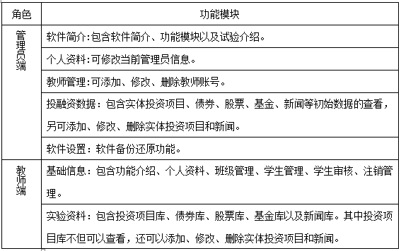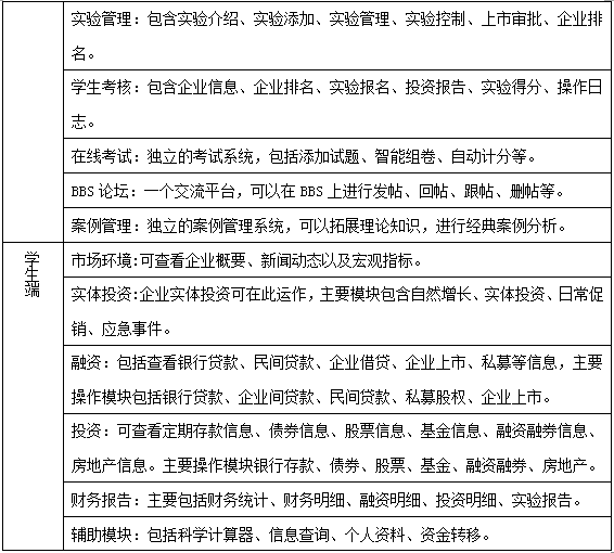 投融(rong)資(zi)決策(ce)實驗是由學生扮演各種(zhong)企(qi)業(ye),教(jiao)師給(gei)定(ding)(ding)企(qi)業(ye)的初始資(zi)金(jin),分為固定(ding)(ding)資(zi)產和流動資(zi)金(jin)兩部分,學生可(ke)以(yi)合理分配(pei)流動資(zi)金(jin),利(li)用銀(yin)行存(cun)款、銀(yin)行貸款、債(zhai)券(quan)、股(gu)票、基(ji)金(jin)、融(rong)資(zi)融(rong)券(quan)、房地產、企(qi)業(ye)間貸款、民間貸款、私募股(gu)權、企(qi)業(ye)上(shang)市(shi)等(deng)投融(rong)資(zi)手段,積累實體投資(zi)資(zi)金(jin)。